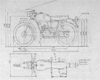 Sur le cadre, le moteur, non suspendu, est fixé par l’embase en trois points : deux boulons à l’avant et un à l’arrière. Le tachymètre est incorporé au phare, ce dernier sans carénage d’origine. L’éclairage est à deux positions, feu de route et feu de croisement. Le poids total de la machine est de 56 kg à vide.