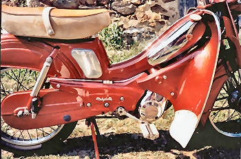 RENAISSANCE : La restauration d’une mobylette, de surcroît à l’état d’épave, nécessite à mon sens le respect des mêmes règles et le même niveau d’exigence que la restauration d’une moto de prestige. C’est dans cet esprit que cette mob a pu renaître. En priorité, réunir toutes les pièces manquantes. Quelques coups de fil bien ciblés, prélèvements sur stock personnel, bourses d’échanges et coup de chance (merci à Jean-Denis DUCRETET pour le robinet d’essence neuf). Montage à blanc pour éviter les surprises, préparations soignée de la tôlerie avant peinture, passage chez le chromeur, révision moteur, et enfin, le remontage qui se termine en janvier 2000. Julien peut alors prendre livraison de la belle, en livrée chaudron et chromes, et sillonner les routes de Seine & Marne !