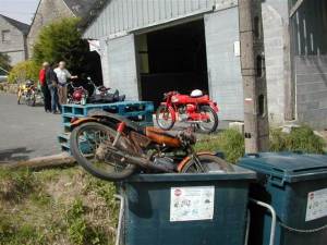 | La pause de midi sera l’occasion d’une petite blague amicale : un Flandria Mistral Orange et... Rouille finira dans une poubelle de tri sélectif, précisons que l’engin tenait plus de la « sortie de grange roulante » que du cyclo de collection, il finira quand même la balade sans faiblir ! L’important, c’est ce qu’il y a dans la boîte, dit le slogan. | ![]() |